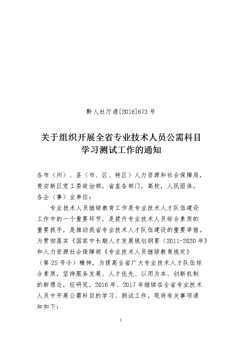 关于组织开展全省专业技术人员公需科目学习测试工作的通知(黔人社厅通[2016]673号)