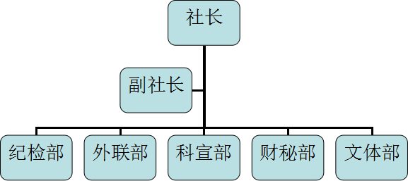 社团设立社长和副社长执行社团内各大重要决定及具体管理协调各部的各项事务;下设五个部门,并设置各部部长,负责管理部内各项事务;