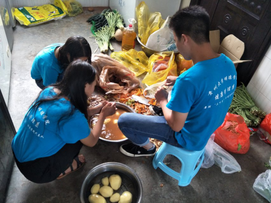 早上大家洗漱完毕之后,便开始打扫整个校园卫生,打包自己的行李;我系(健康管理系)的同学为大家准备在旧普小学的最后一餐。