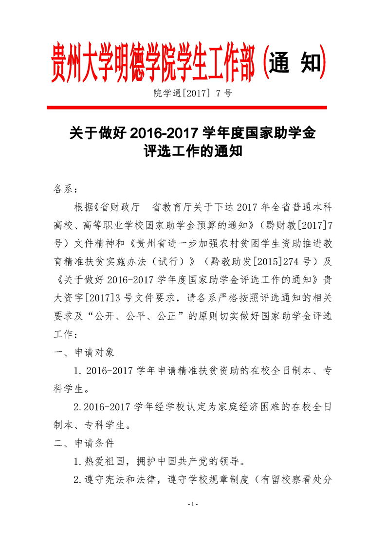 关于做好贵州大学明德学院2017-2018学年国家奖学金评选工作的通知
