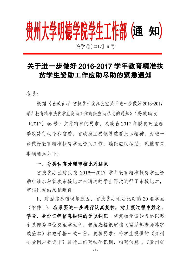 贵州大学明德学院关于进一步加强教育精准扶贫学生资助工作的紧急通知
