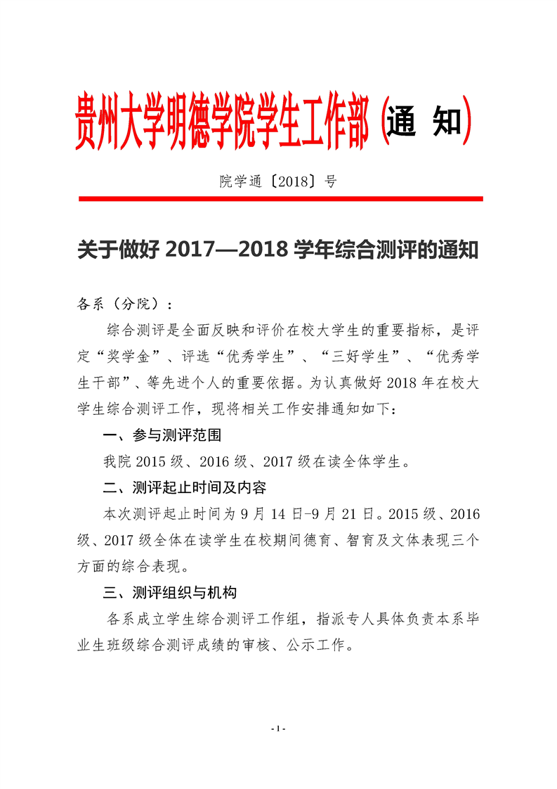 贵州大学明德学院关于评选2018年贵州省普通高等学校三好学生、优秀学生干部、先进班集体的通知