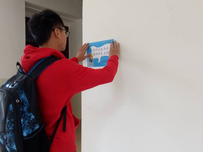 本次活动分小组进行,学生会各个部门为一个小组自己收集标语并制作,然后分别在生物楼每层的教室、走廊、楼梯道、厕所进行美化粘贴。粘贴过程有条不紊,其中粘贴的各类标语用独到丰富的语言,简洁明了的表达了爱护校园的意义。