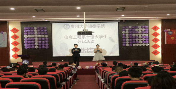 2018年10月26日中午12:20 贵州大学明德学院信息工程系“泰豪之星·十佳大学生”评选活动在贵州大学明德学院1号报告厅隆重举行,参与本次活动的老师有:贵州大学明德学院党委副书记金明辉副书记、贵州大学明德学院院长助理、学生工作处处长宿强老师、学生工作处副处长张吉林老师、信息工程系系主任江奇峰老师、各系党总支代表老师、各系团总支代表老师、信息工程系全体老师,参与本次活动的学生有:信息工程系各班学生代表及信息工程系团总支学生会全体成员。