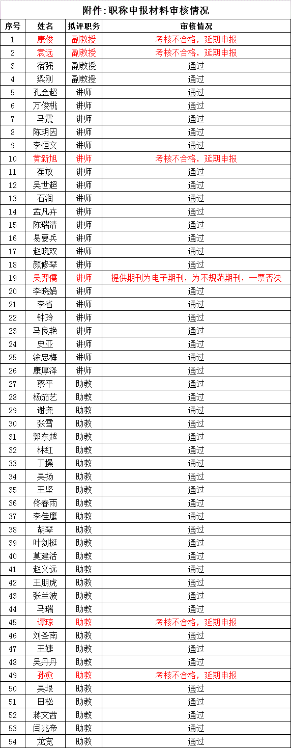经学院人力资源处初审,并报学院学术委员会审议,2019年度我院申报职称评审共计54人,其中副教授4人,讲师22人,助教28人。其中5人因考核不合格延期申报,1人因提供期刊材料为电子版期刊,不能作为支撑材料,审核不予通过。