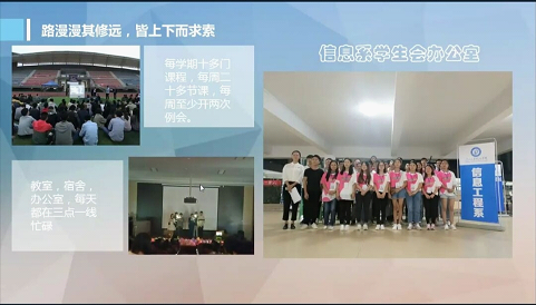 活动开始,观众们观看了一段来自信息工程系团总支学生会成员以及评选人员的同学、朋友为他们加油鼓劲的祝福视频。评选正式开始,十佳毕业生候选人首先进行我介绍,接着开始PPT共享展示。通过ppt展示我们了解到他们四年大学的精彩生活,给信息工程系的低年级同学树立了榜样。在各位参选人员讲解自己的ppt后,四位评委老师通过线上提问的方式并进行现场打分,五位学生评委进行在线观看打分。