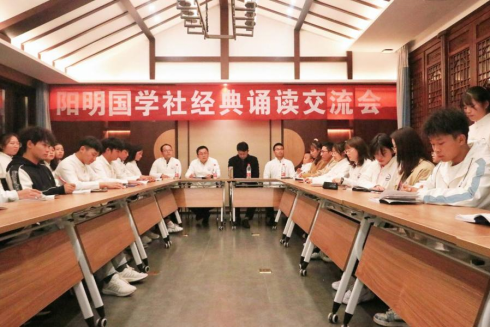 新闻网训(团委/罗一檾 文字/刘旭涛 杨梦颖 图片/李伶俐) 寒霜降、冬将至,为弘扬中华民族优秀传统文化,以经典诵读培养学生的人文素养,借助国学经典帮助学生明心见性。2021年10月29日晚上七点,我院于阳明书院举办“阳明国学社国学经典诵读交流会活动暨国学经典教育启动仪式”。校长助理黄晓儒、校办公室主任李恒文、经济管理系党总支书记朱成龙、经济管理系团学办负责人赵义远出席此次活动,阳明国学社全体成员参与活动。