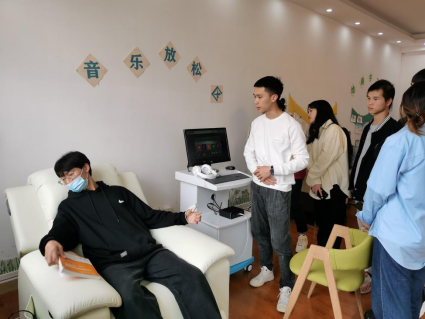 在接待室,石琳老师耐心细致地向同学们讲解心理咨询预约的基本流程,讲解咨询老师如何帮助学生解决心理问题。在心理咨询室,一盘细沙,一架子各式各样的沙具,就在这简易的设置中一个人内心的世界得以呈现,通过石琳老师的介绍,同学们了解到沙盘是一种辅助心理治疗的游戏,使用者可通过自己印象中的物件在沙区摆盘,从其所呈现的最终样式可以看出使用者当时的心理状态。在宣泄室,同学们拿着尖叫鸡、拳套、击打棒等工具体验起来,在平时的学习生活中,当同学们压力大时可到宣泄室发泄情绪。同时,宣泄室里还配有生涯导航自助系统,当同学们对自己的航向较为迷茫时可通过生涯导航系统为自己进行初步定位,例如适合某个方向的职业或偏向艺术型等。在心理放松室中,同学们可以将内心冲突所产生的负性情绪、心理能量通过一个安全合理的途径和方式得以缓解。同学们可在音乐放松区通过音乐椅放松或通过瑜伽疏导心情或通过绘画手工调节自我情绪。在团体辅导室,大家了解到团体心理辅导的意义和活动组织形式,许多班级在此开展团辅增强班级凝聚力以及为校内心理委员开展心理培训。
