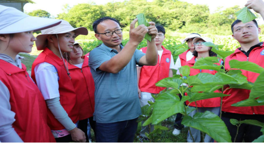 图为养蚕农户在桑蚕基地为实践队志愿者讲解桑叶辨别和采摘知识。