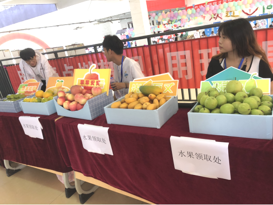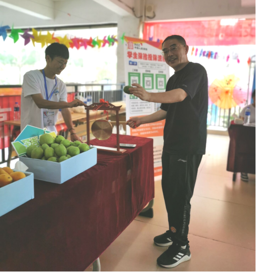 信息工程系迎新工作点以“水果伴作礼物·寓意寄托祝福”为主题,以五种类型水果寓祝福之意,为远道而来的新生学子及其家长们送上信息工程系师生诚挚的祝福与欢迎。五种水果中柿子寓意“事事如意”、橙子寓意“心想事成”、苹果寓意“平平安安”、芒果寓意“光芒万丈”、梨子寓意“大吉大利”,且均放置字牌予以标识。每位新生可任选自己喜欢的水果类型,并在自己敲下的一声清脆锣响中开启寓意美好的新学期。