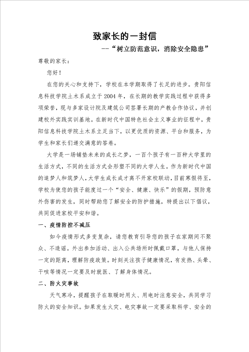 致家长的一封信--“树立防范意识,消除安全隐患”