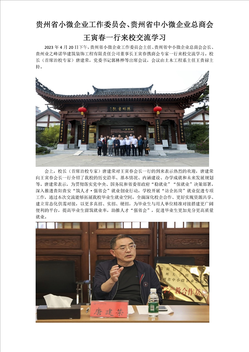 贵州省小微企业工作委员会、贵州省中小微企业总商会王寅春一行来校交流学习
