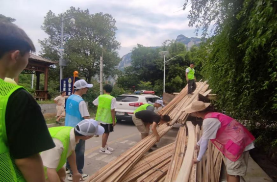 在安全大会结束之后,老师带领部分同学去村委会进行交接工作,在途中遇到一辆搬运木材的车辆在运转途中木材突然从车上滑下,然后我老师与学生一起把木材重新搬上车。剩余的同学进行了简单的分组,一部分打扫学校的卫生和整理物资,另一部分准备午餐。