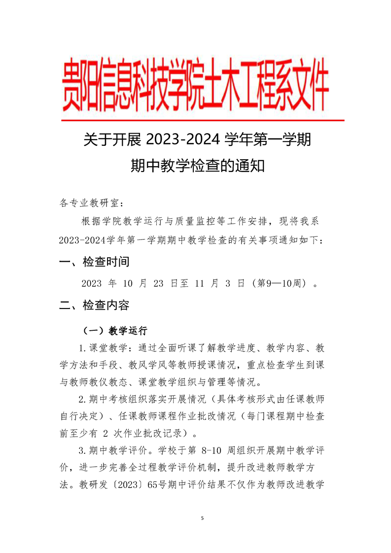 beat365在线唯一官网土木工程系关于开展2023-2024学年第一学期期中教学检查的通知