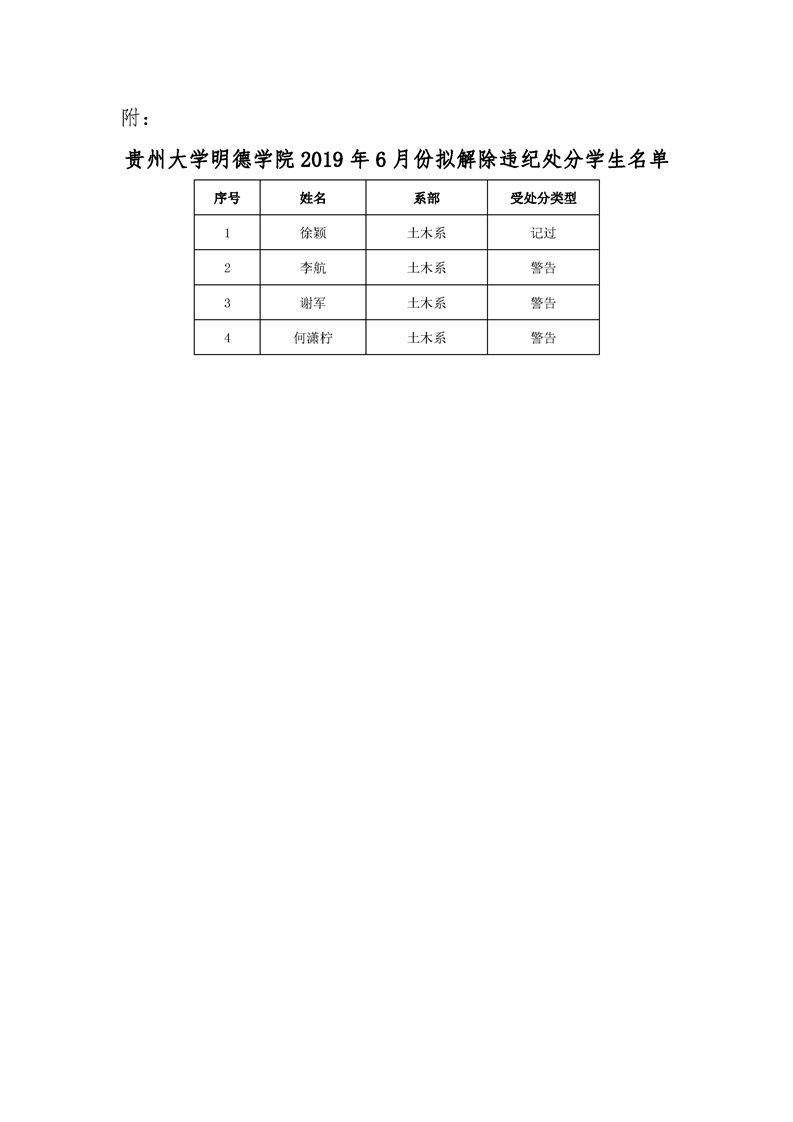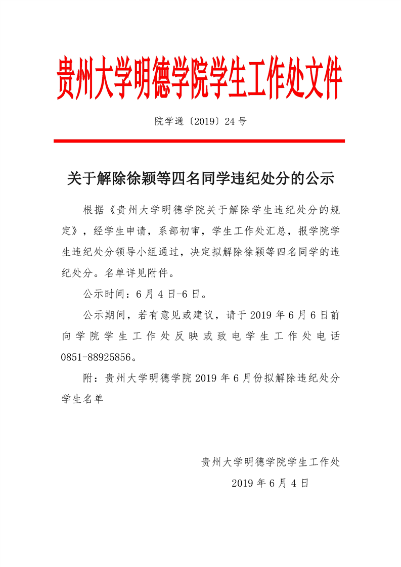 关于解除徐颖等四名同学违纪处分的公示