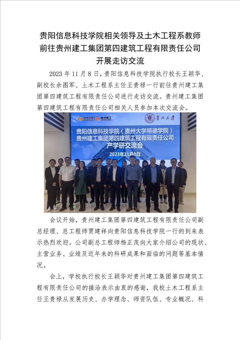 beat365在线唯一官网相关领导及土木工程系教师前往贵州建工集团第四建筑工程有限责任公司开展走访交流