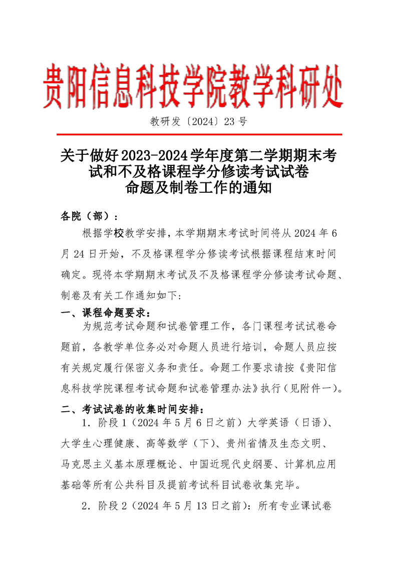 关于做好2023-2024学年度第二学期期末考试和不及格课程学分修读考试试卷命题及制卷工作的通知