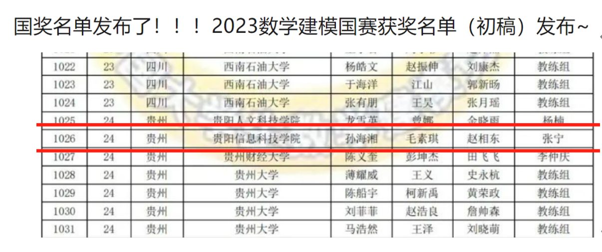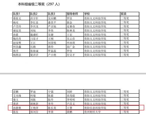 通过三天的激烈角逐,由beat365智能工程系张宁、王慧、信息工程系惠芸老师带队,孙海湘、毛素琪、赵相冬、孙静秋、王艳萍、陈长美、安森景琦、刘蝶、徐开静等同学组成的beat365在线唯一官网代表队斩获“2023全国大学生数学建模大赛全国二等奖”,“2023全国大学生数学建模大赛贵州省二等奖”,“2023全国大学生数学建模大赛贵州省三等奖”。