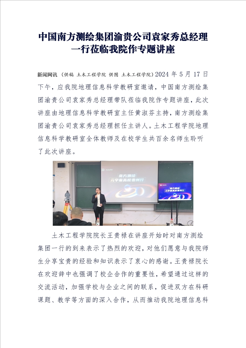 中国南方测绘集团渝贵公司袁家秀总经理一行莅临我院作专题讲座
