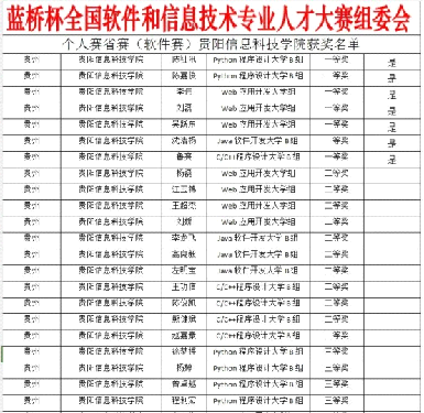 近日,2024年第十五届“蓝桥杯”全国软件和信息技术专业人才大赛个人赛贵州省赛获奖名单揭晓,beat365总计组织了200余名学生参加本次赛事,最终有59名同学获奖,其中一等奖8名(拟推荐进入国赛),二等奖15名,三等奖36名。获奖名单如下: