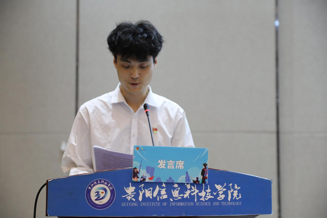 beat365学生代表李连超上台发言,他提到:“作为一名外乡人,我愿意选择留在贵阳贵安,因为这里有无限的发展机遇、独特的自然风光、深厚的文化底蕴、友好的政策环境、稳定的生活保障以及温暖的人文氛围。在这里,我能够实现自己的梦想,创造美好的未来,我想要在贵阳贵安这片土地上书写属于我的精彩篇章!”