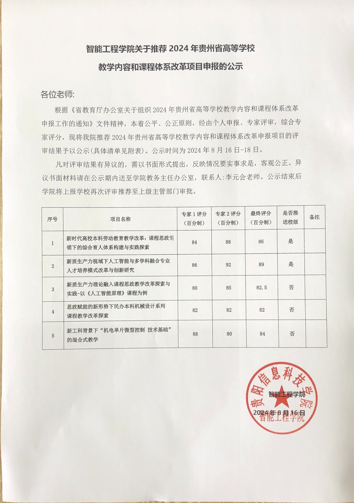 智能工程学院关于推荐2024年贵州省高等学校教学内容和课程体系改革项目申报的公示