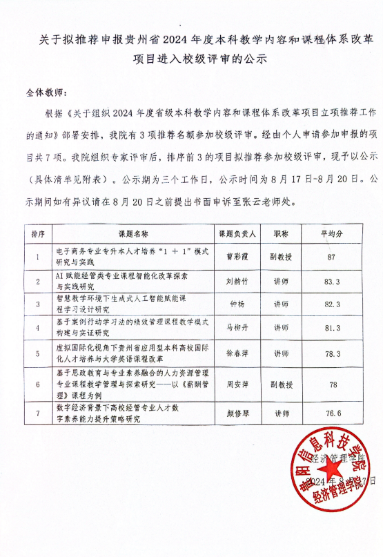 关于拟推荐申报贵州省2024年度本科教学内容和课程体系改革项目进入校级评审的公示