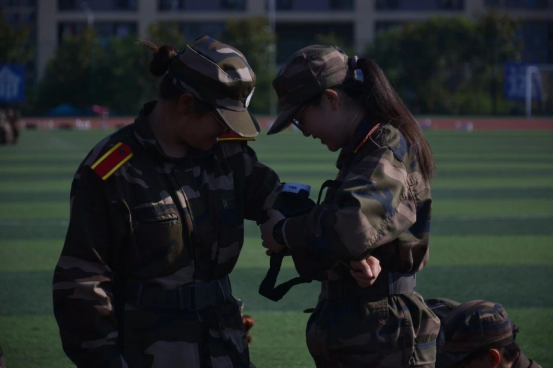 炎炎烈日下的坚毅身影,既有教官的严谨教导,也有汗水与努力的交织。新生们在军训场上专注地训练。运动场上,四营(31连、28连)为了培养学生的急救技能,提高自救互救能力,以及掌握基本应急救护知识。在教官的指导下,新生们学习了伤员包扎技巧,并相互协作进行实操演练。