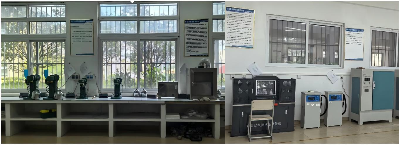 该实验室主要设备:水泥净浆搅拌机、水泥胶砂搅拌机、水泥胶砂振实台、全自动水泥抗折抗压试验机、维卡仪、沸煮箱、恒温恒湿养护箱等检测设备。该实验室开出的主要课程实验有:(1)水泥凝结时间、安定性实验;(2)水泥胶砂强度实验;(3)水泥细度实验等相关实验。