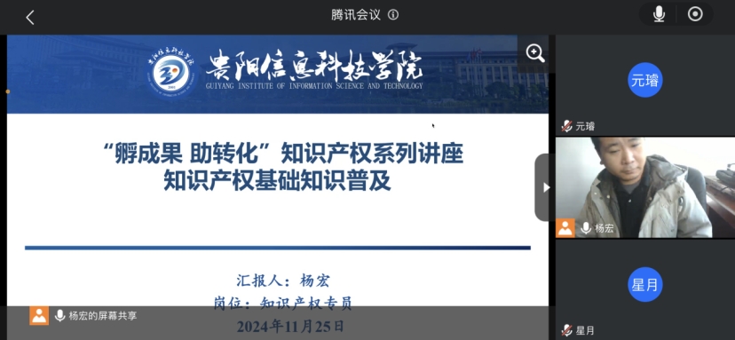 杨宏根据国家知识产权局贵阳办事处近期主办的“国家知识产权局专利局贵阳代办处2024年度知识产权申请注册宣讲专题培训班”的授课知识内容,结合beat365师生在日常工作及创新创业活动中遇到的知识产权相关的常见问题进行了统一讲解。