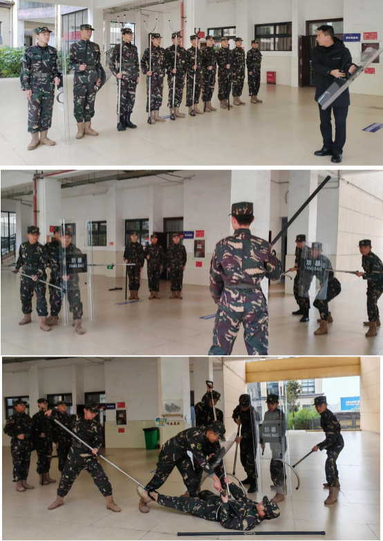 为进一步提高护卫队队伍业务技能和素质,提升校园处置突发事件的能力,在学校保卫处老师的组织和指导下利用课余时间开展防暴处突技能训练,对防暴器械装备使用技巧,盾、棍、叉三人协同战斗队形及突发事件处置流程进行系统学习,全面提升协助保卫处开展安全工作的综合能力。