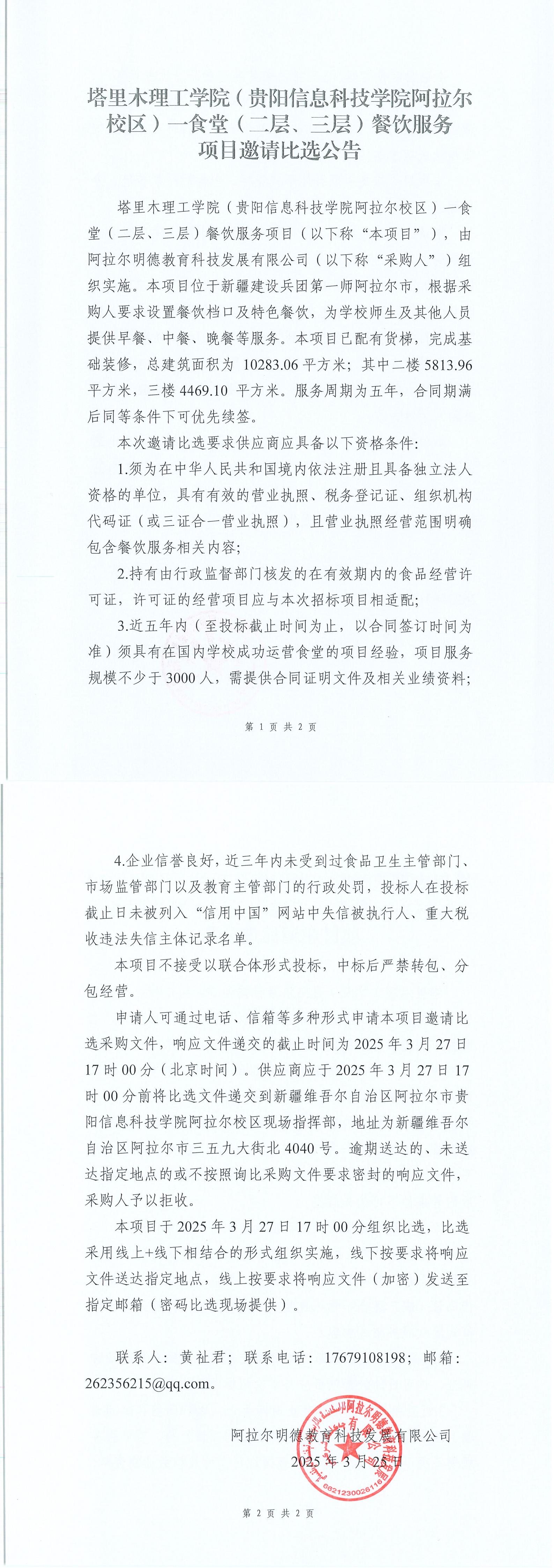 塔里木理工学院(beat365在线唯一官网拉尔校区)一食堂(二层、三层)餐饮服务项目邀请比选公告