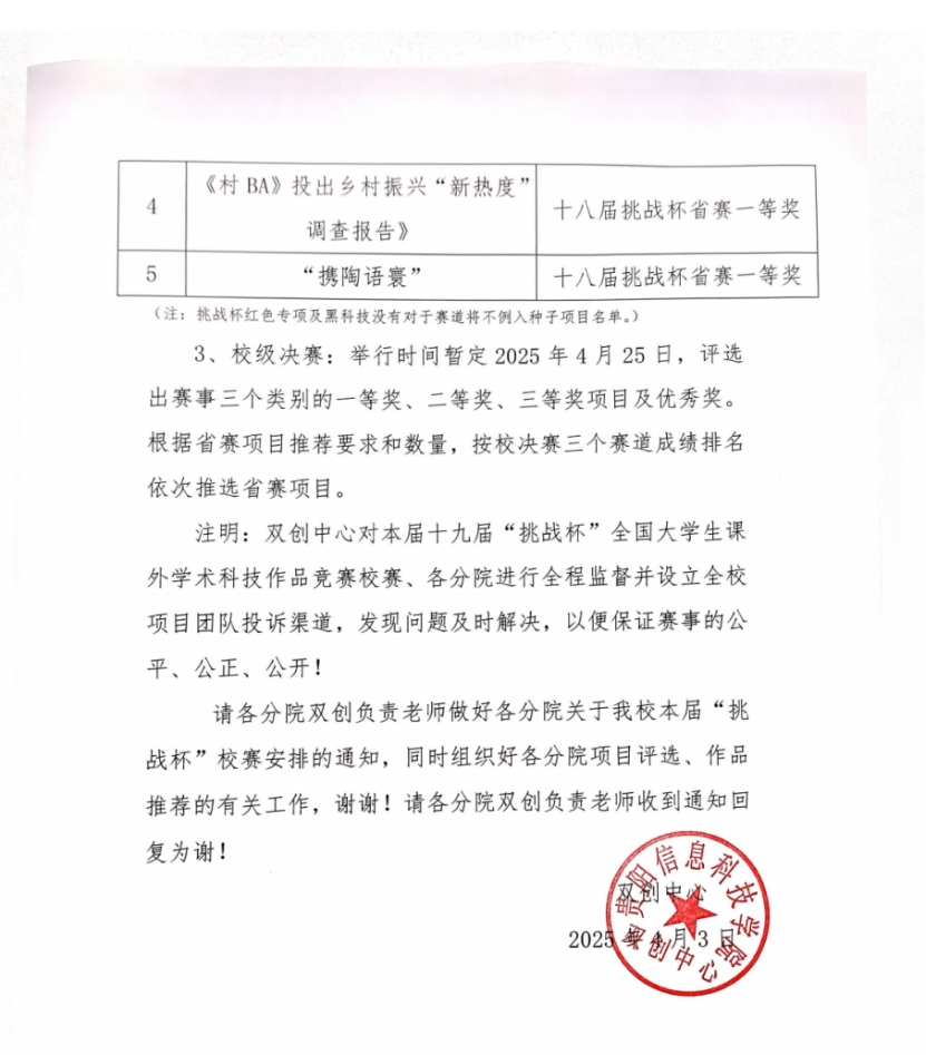 根据领导有关指示,经中心研究,作beat365本届“挑战杯”校赛具体安排见以下附件通知: