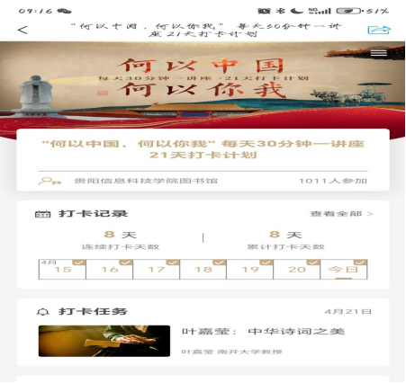 《何以中国,何以你我》每天打卡30分钟讲座,读者们通过线上平台聆听专家学者的精彩讲座,内容涵盖中国历史、文化、哲学等多个方面。21天的坚持打卡,不仅让大家积累了丰富的知识,更培养了持之以恒的学习精神。
