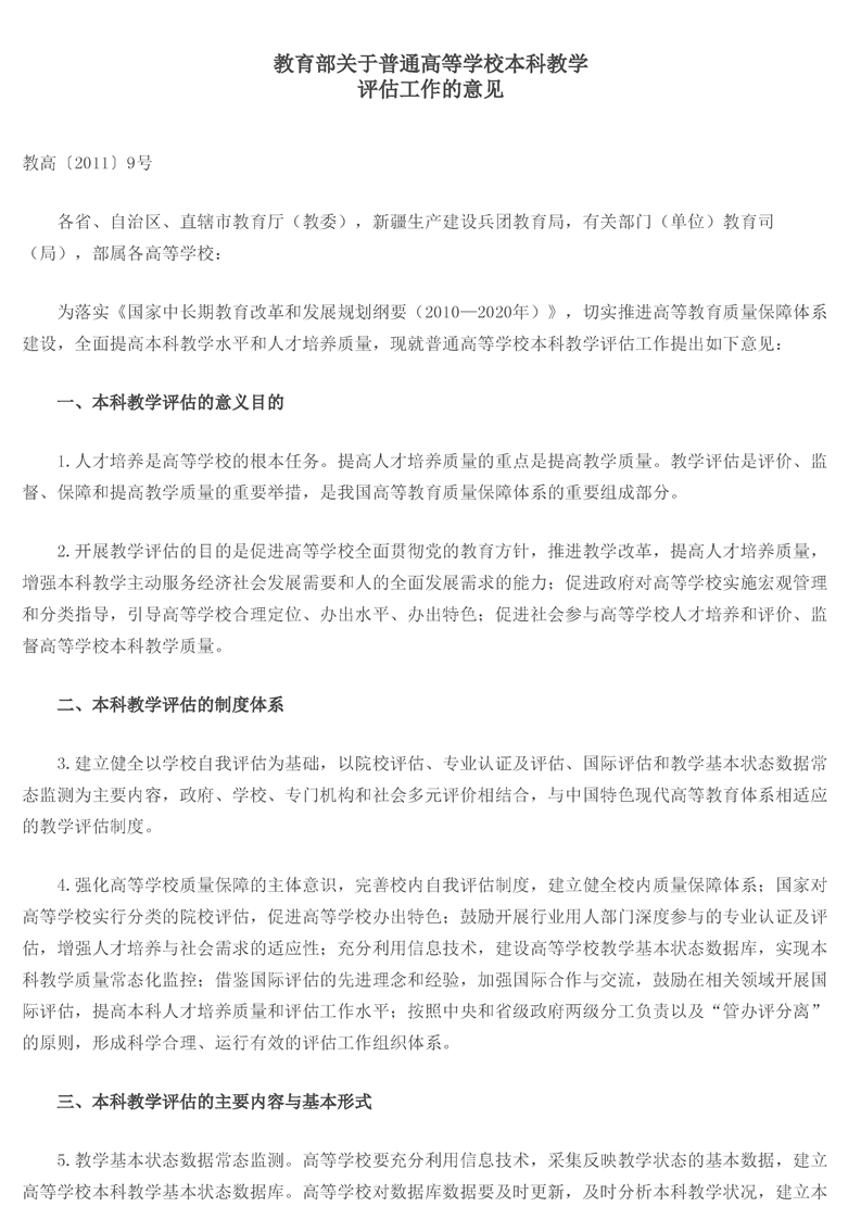 教育部关于普通高等学校本科教学评估工作的意见