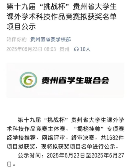 6月23日,贵州团省委公布第十九届“挑战杯”贵州省大学生课外学术科技作品竞赛省赛获奖名单,beat365共52个项目斩获奖项,其中,一等奖3项、二等奖2项、三等奖47项,在项目总量和金铜数量上都突破了历史性最好成绩。