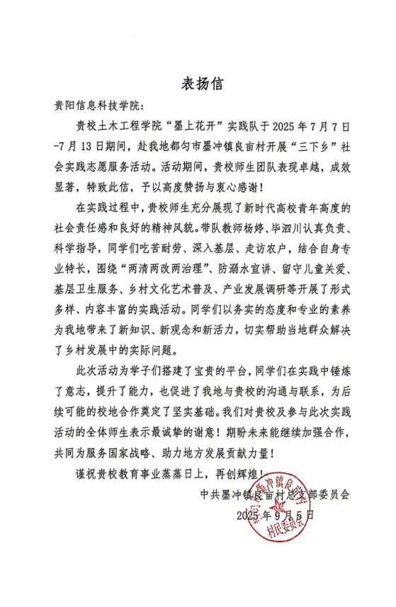 这封表扬信不仅是对学院实践团队的肯定,更是对学院育人成果的生动见证。带队教师表示,同学们将课堂所学转化为助力乡村振兴的实际行动,在汗水与欢笑中锤炼了本领、收获了成长。未来,学院将继续深化校地合作,引导更多学子在乡村振兴一线书写青春答卷,让专业实践成为青年成长的“第二课堂”。