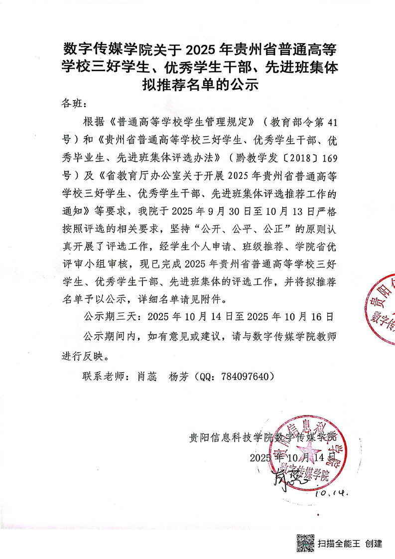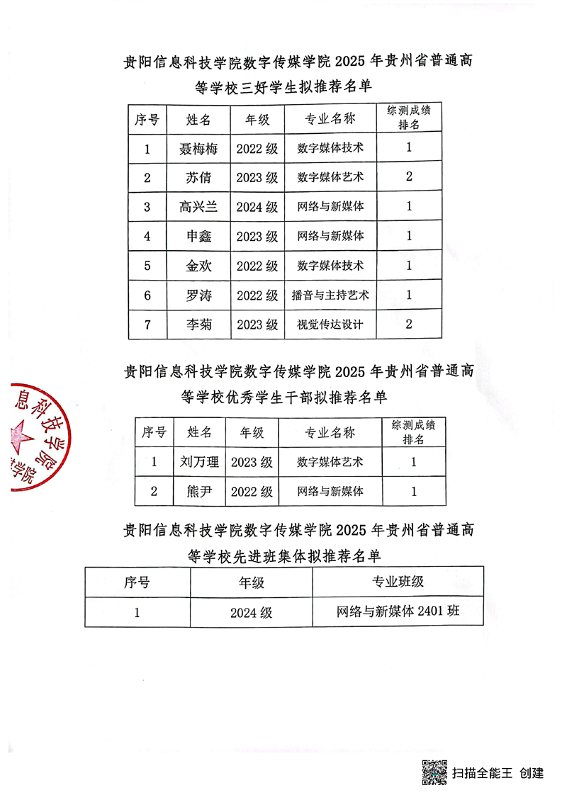数字传媒学院关于2025年贵州省普通高等学校三好学生、学生优秀干部、先进班集体拟推荐名单的公示