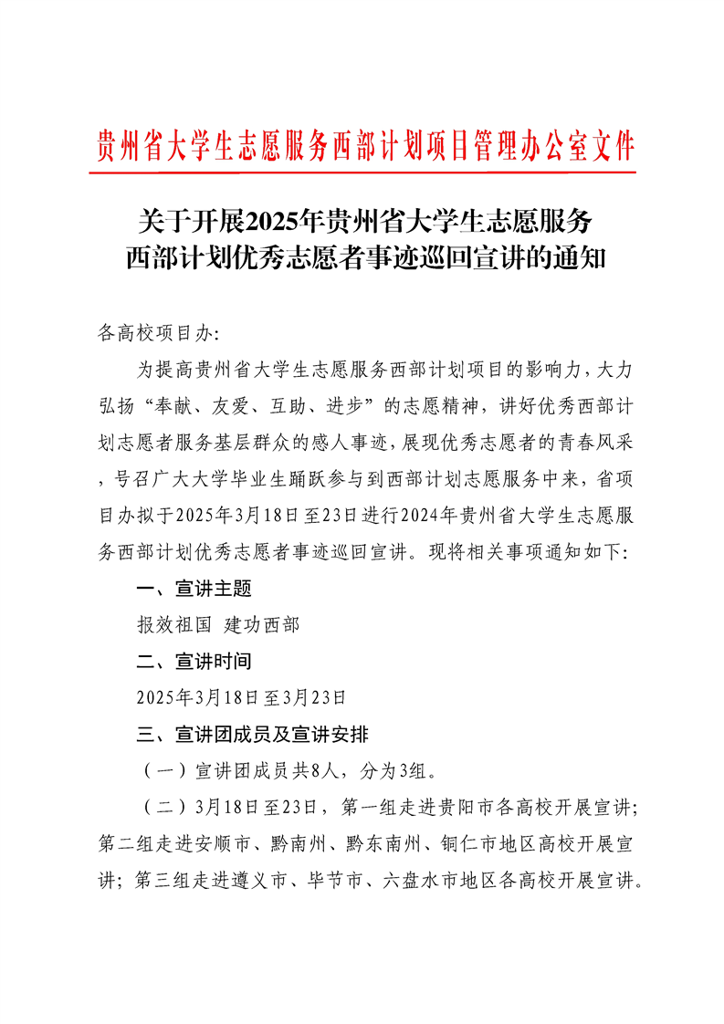关于开展2025年贵州省大学生志愿服务西部计划优秀志愿者事迹巡回宣讲的通知