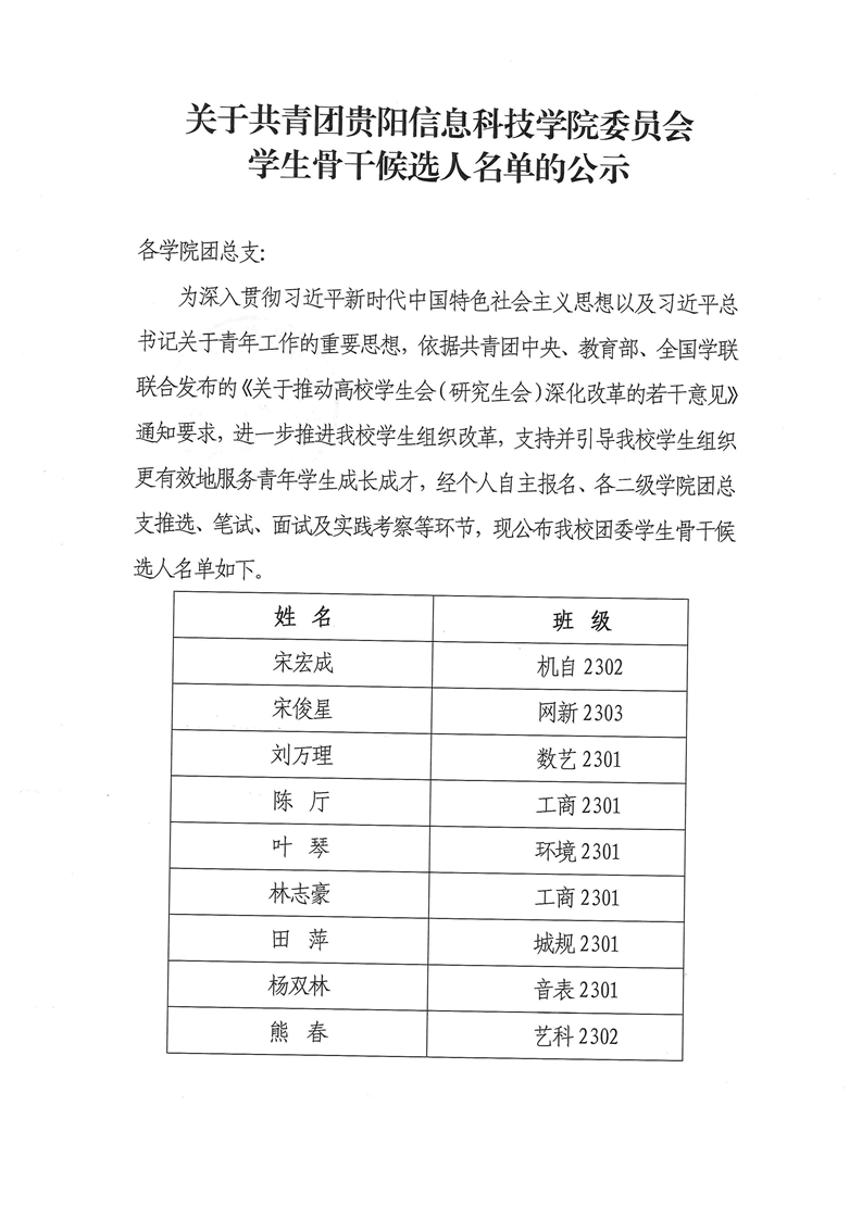 关于共青团beat365在线唯一官网委员会学生骨干候选人名单的公示