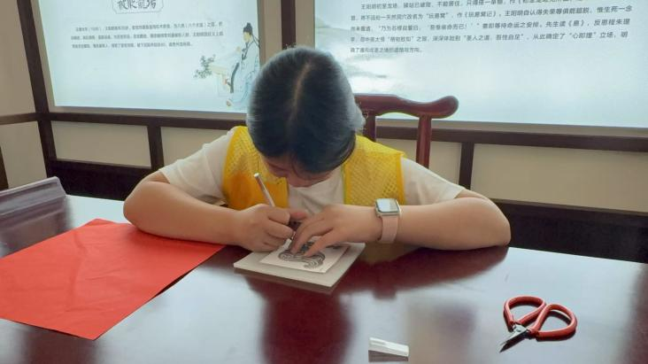 在学校的精心安排下,师生们在校园内便深度体验了丰富的非遗与传统文化:跟着贵州思南非遗剪纸非遗传承人陈露露老师学习剪纸技艺,认真刻画属于自己的作品,感受传统手工艺的精妙;在张可欣老师的精心策划下,研学团沉浸式参与了贵州少数民族非遗音乐赏析课 —— 伴着苗族飞歌的婉转、侗族大歌的多声部共鸣,师生们在原生态旋律中轻舞,近距离聆听少数民族同胞的嘹亮歌喉;走进学校阳明书院,学习体验儿童德行礼与传统释菜礼 —— 换上雅致汉服,在古色古香的书院场景中,学习中华传统礼仪,在拜师礼、敬师茶的互动中,体悟 “尊师重道” 的中华传统美德。