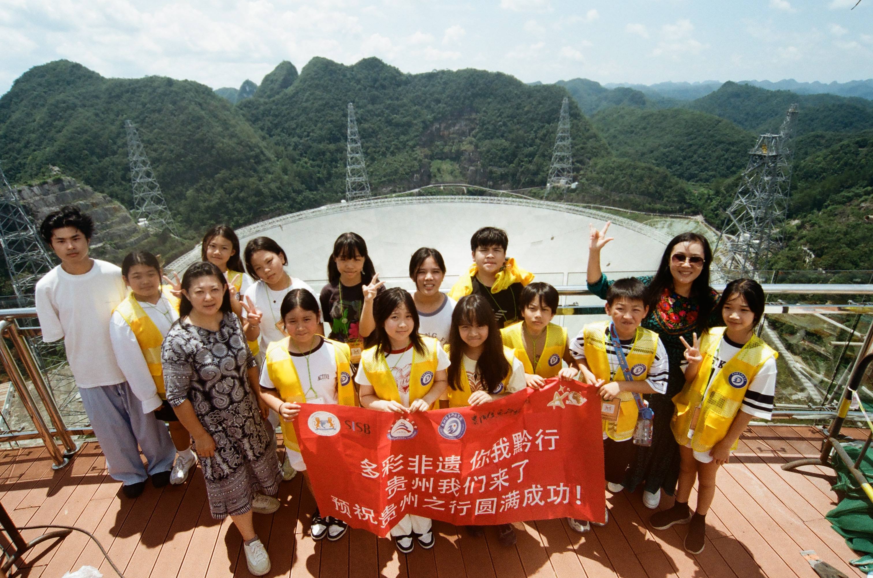 科技探索环节中,研学团走进贵州省地质博物馆,解码地球演化奥秘;登顶“中国天眼”瞭望台,在国际天文体验馆感受宇宙浩瀚,向“天眼之父”南仁东致敬;参观世界第一高混凝土塔桥—— 平塘特大桥,领略中国基建的硬核实力。