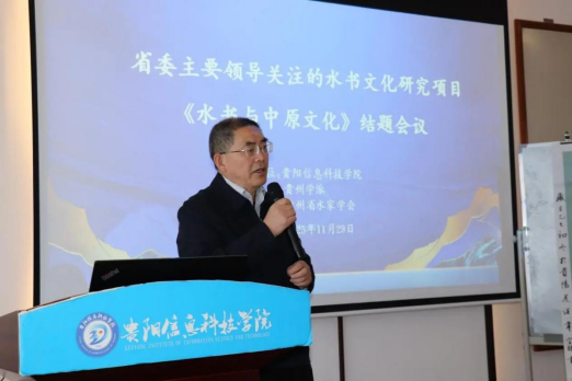 贵州文史馆馆员、《水书与中原文化》项目主持人潘朝霖研究员汇报了项目的结题情况。他围绕水文创制、水文造字、水书历法与华夏古代历法的关联等,详细阐述了水书与中原文化的渊源与联系。《水书与中原文化》项目成果为学术专著,拟分为十二章、五十余万字,该书图文并茂。结题后的出版将出专著的角度弥补水书与中原文化领域的专著研究的学术空白,具有重要的学术意义。