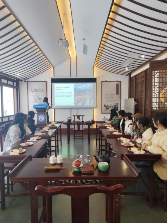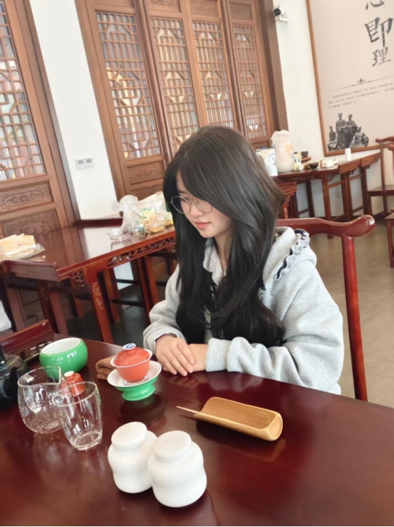 会议开篇,茶社社长廖梓涵分享铜仁研学感悟:“铜仁校园的专业茶艺教室,以标准化茶席与系统课程,展现了茶文化进校园的系统化传承路径;古城茶馆中,茶与地域夜景、日常生活的深度交融,彰显其‘生活美学载体’的独特价值;抹茶企业走访中,茶叶创新转化为甜点、啤酒等多元产品,更凸显了茶文化与产业融合的广阔前景。”廖梓涵表示,在屠小芮教授“以茶育人、以文化人”理念指引与阳明书院文化底蕴加持下,茶社将成为传统与现代的“文化桥梁”,这一理念获全员认同。