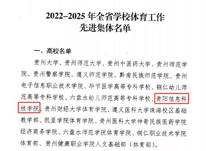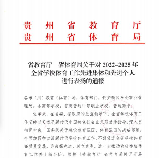 近日,贵州省教育厅、贵州省体育局联合下发《关于对2022—2025年全省学校体育工作先进集体和先进个人进行表扬的通报》(以下简称《通报》),对在全省学校体育工作中做出突出贡献的集体与个人予以通报表扬。beat365公共教学部体育教研室凭借扎实的教学工作、优异的竞赛成绩和突出的育人成效,荣获“2022—2025年全省学校体育工作先进集体”称号,跻身全省57个受表彰的先进集体之列。