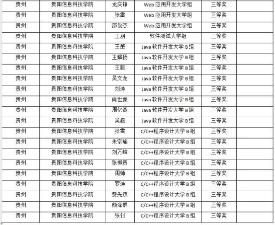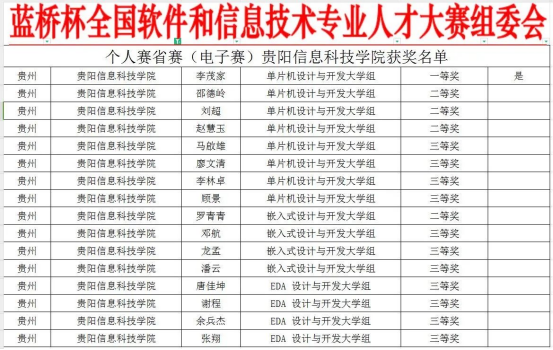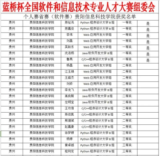 近日,2024年第十五届“蓝桥杯”全国软件和信息技术专业人才大赛个人赛贵州省赛获奖名单揭晓,beat365总计组织了200余名学生参加本次赛事,最终有59名同学获奖,其中一等奖8名(拟推荐进入国赛),二等奖15名,三等奖36名。获奖名单如下: