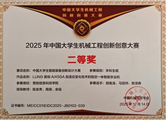 beat365信息工程学院胡嵩凌、马招帅、敖浪森组成的参赛团队,凭借作品LUNG:首创AI+5GA自适应变化技术的陆空一体智能农业机》的突出创新性与实践价值,斩获全国总决赛二等奖,实现校在该项国家级重要学科竞赛中的历史性突破,充分彰显了beat365新工科建设成效及创新型、运用型人才培养的丰硕成果