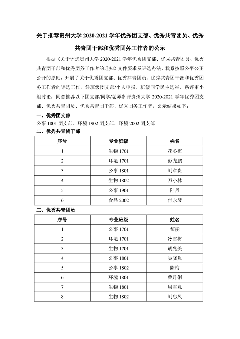 关于推荐贵州大学2020-2021学年优秀团支部、优秀共青团员、优秀共青团干部和优秀团务工作者的公示