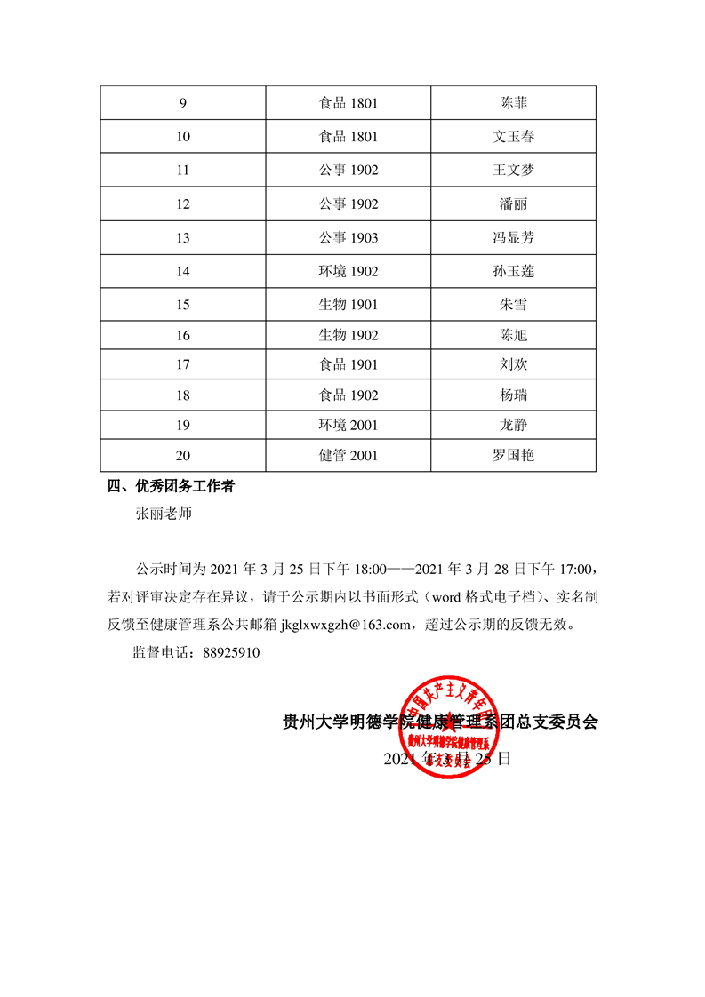 关于推荐贵州大学明德学院2020-2021学年优秀团支部、优秀共青团员和优秀共青团干部的公示