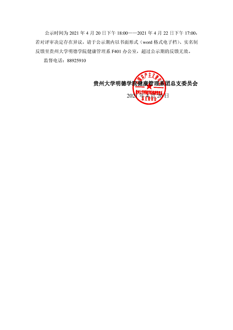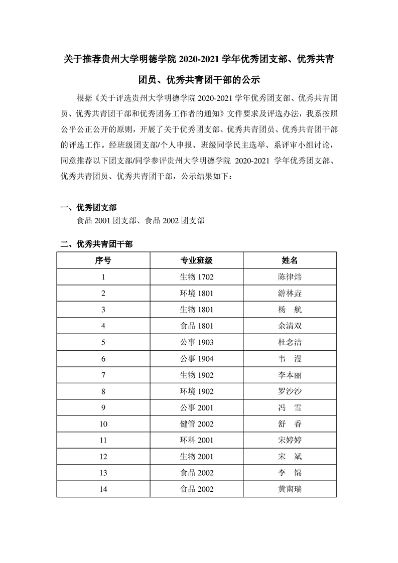 关于推荐贵州大学明德学院2020-2021学年优秀团支部、优秀共青团员和优秀共青团干部的公示